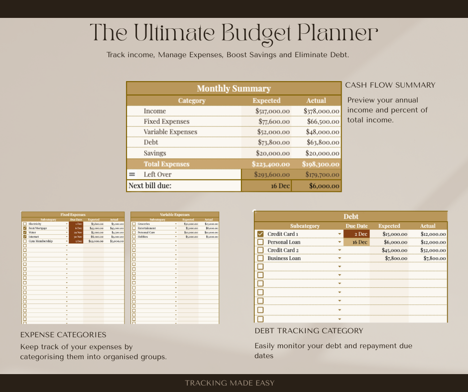 Track income, fixed expenses, variable spending, debt, and savings. -